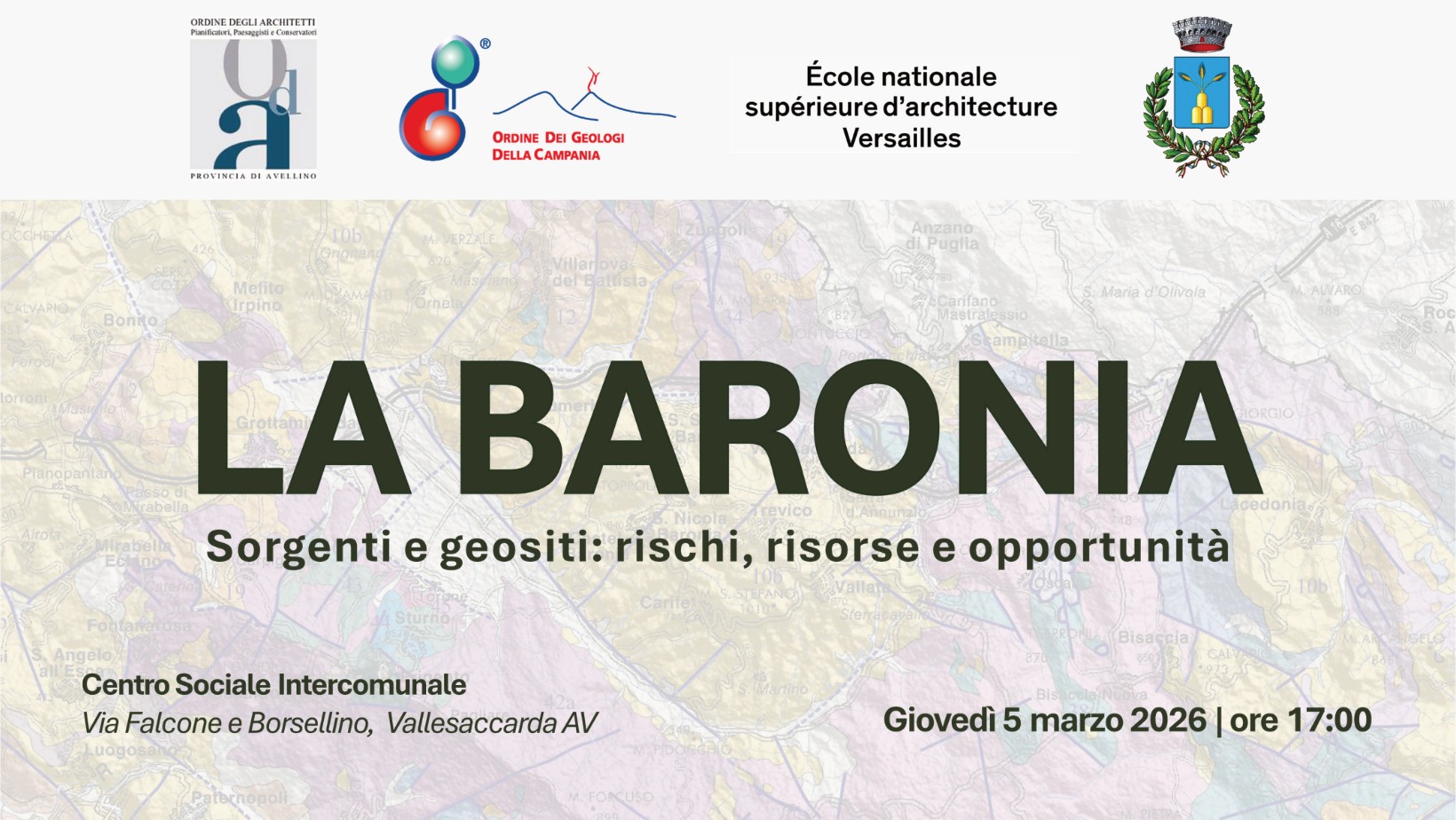 Il 5 marzo 2026, alle ore 17:00, si terrà presso il Centro Sociale Intercomunale di Vallesaccarda (Via Falcone e Borsellino) un incontro dedicato al territorio della Baronia, con focus su sorgenti e geositi: la loro valenza scientifica, i rischi connessi e le opportunità di valorizzazione.