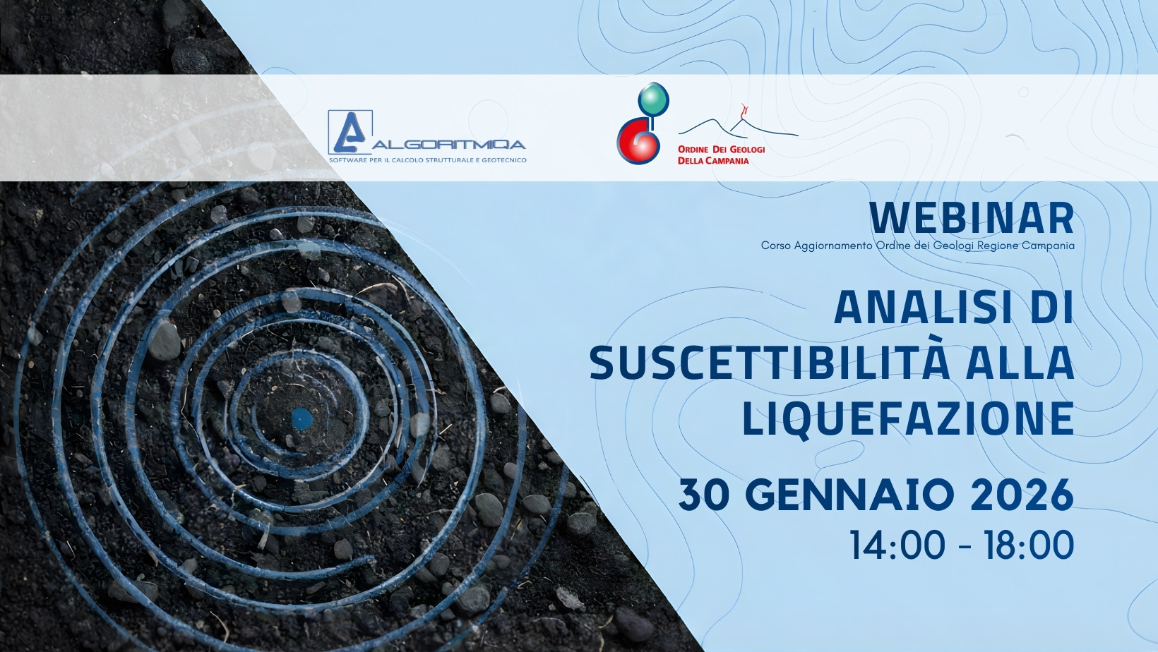 Il 30 gennaio 2026, dalle ore 14:00 alle 18:00, si terrà in modalità webinar il Corso di Aggiornamento Professionale “Analisi di suscettibilità alla liquefazione: dai metodi classici agli approcci numerici basati sulla risposta sismica locale“, organizzato dall’Ordine dei Geologi della Regione Campania in collaborazione con Algoritmiqa.