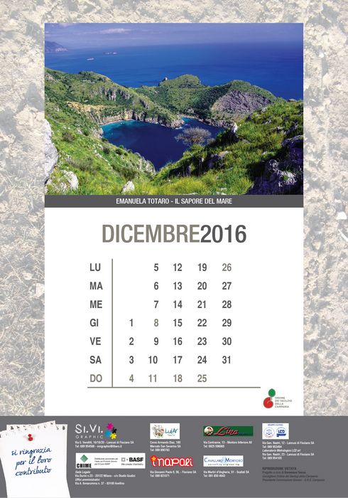 Fanno parte del Calendario: ANSELMO PIZZUTELLI, COLTIVAZIONE DI ALGHE; PASQUALE D’ANDREA con IL CERCHIO DELLA VITA, ROBERTO LUBRANO con LACRIMA CHRISTI, SABINA PORFIDO con LE TERRE DI GRANO A CAIRANO, MARCO CATALANO con LA VACCA NEL GRANO.